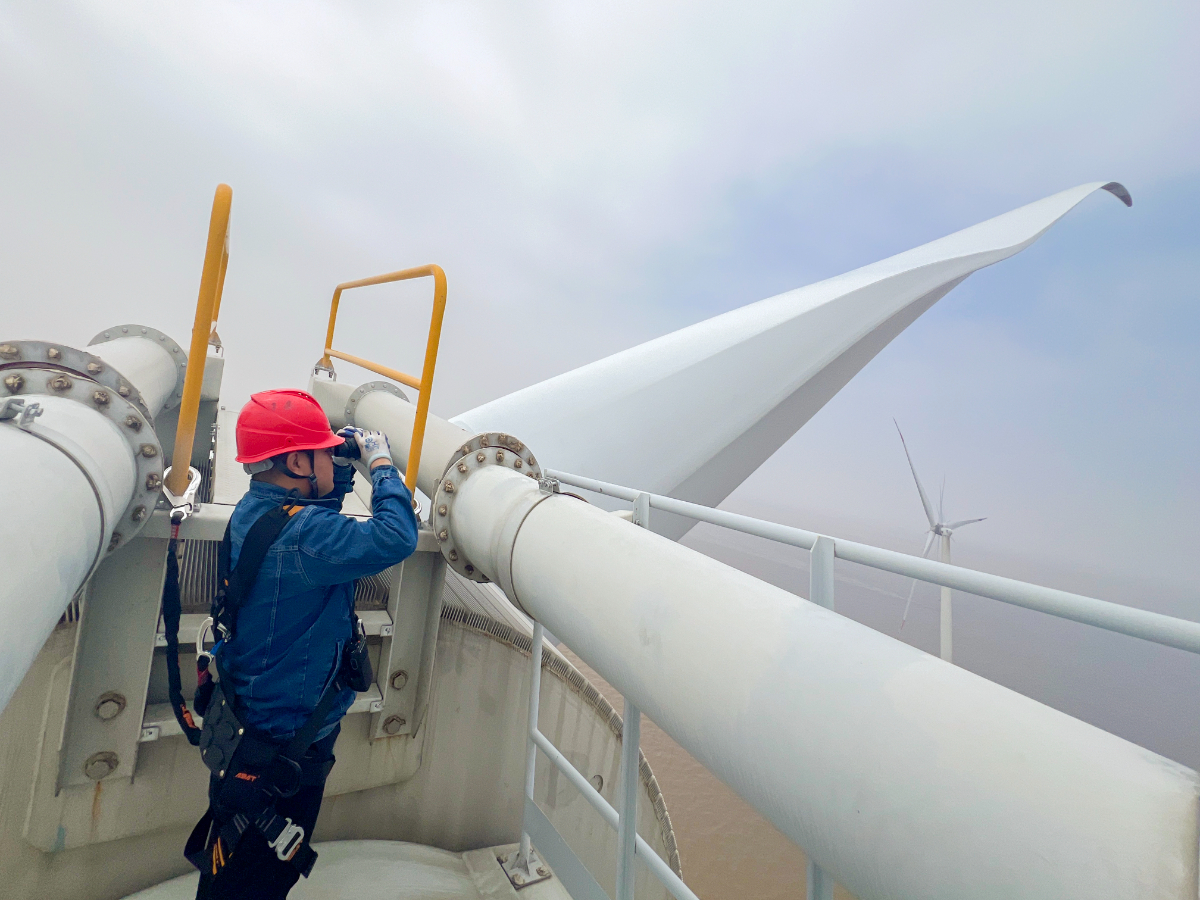 瑜伽色情 海上风电维护人员对风机叶片进行定期检查。 张露 提供