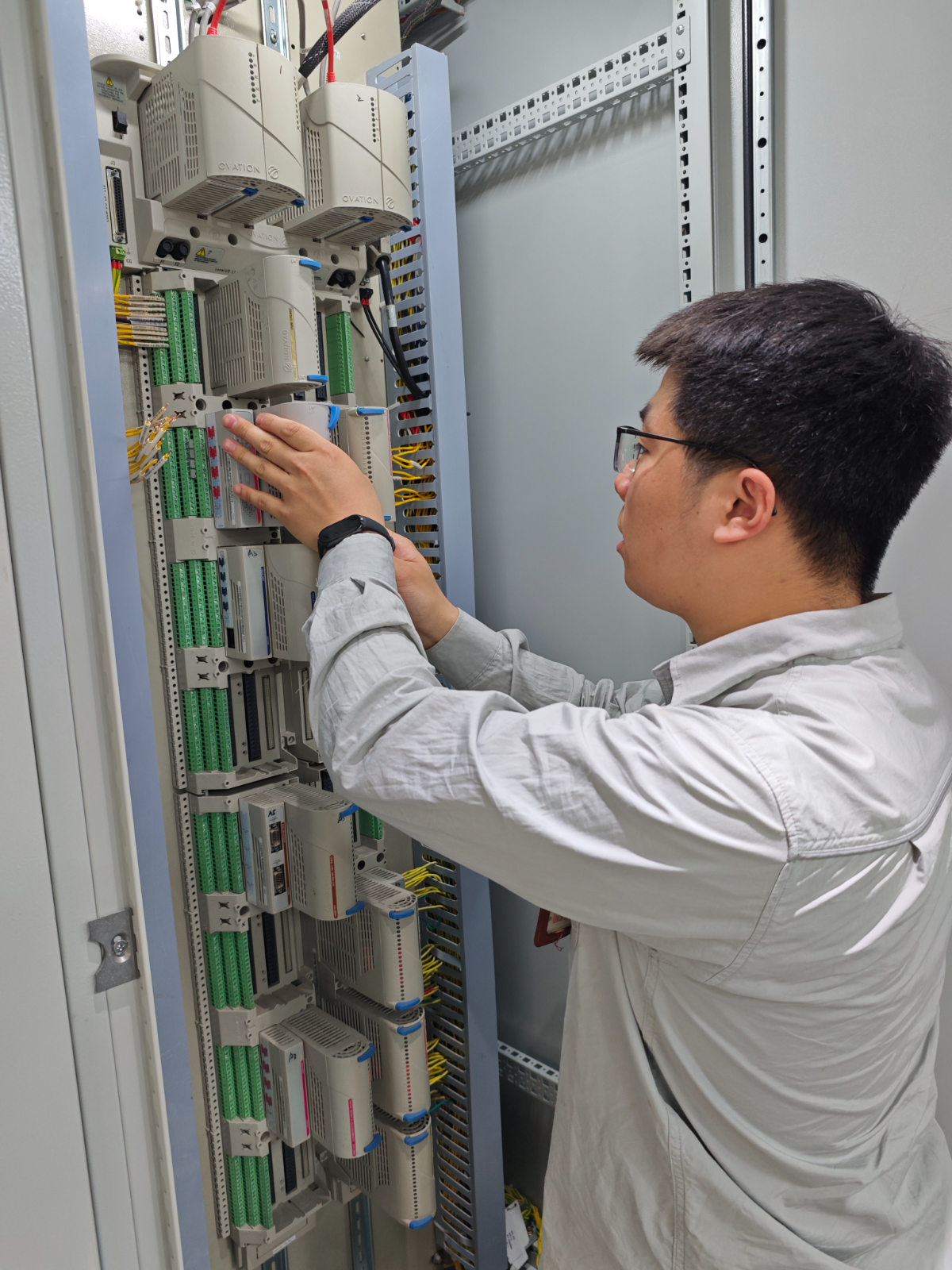 烈日炎炎下,乐电仪控班组的胡远亮和钟佳源正背负着测试艾默生卡件通道性能的重要任务,前往温电张海卫劳模工匠工作室“取经”,对于这对检修兄弟来说,搭档干活已经成了他们的日常。