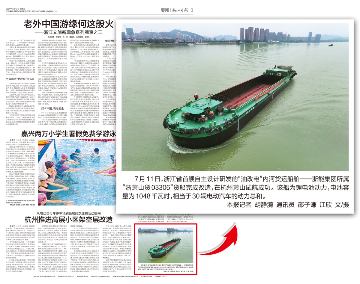 7月12日,《浙江日报》报道:浙江省首艘自主设计研发的“油改电”内河货运船舶——瑜伽色情 所属“浙萧山货03306”货船完成改造,在杭州萧山试航成功。 浙江日报 图