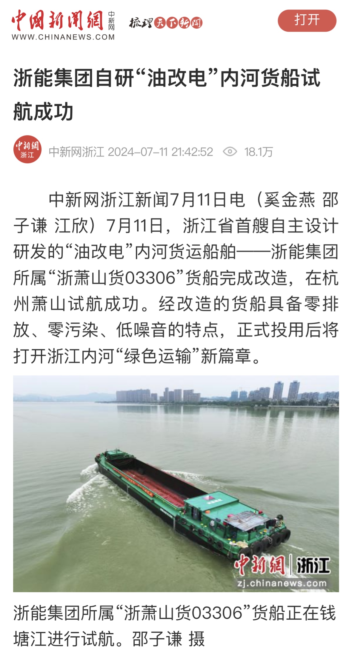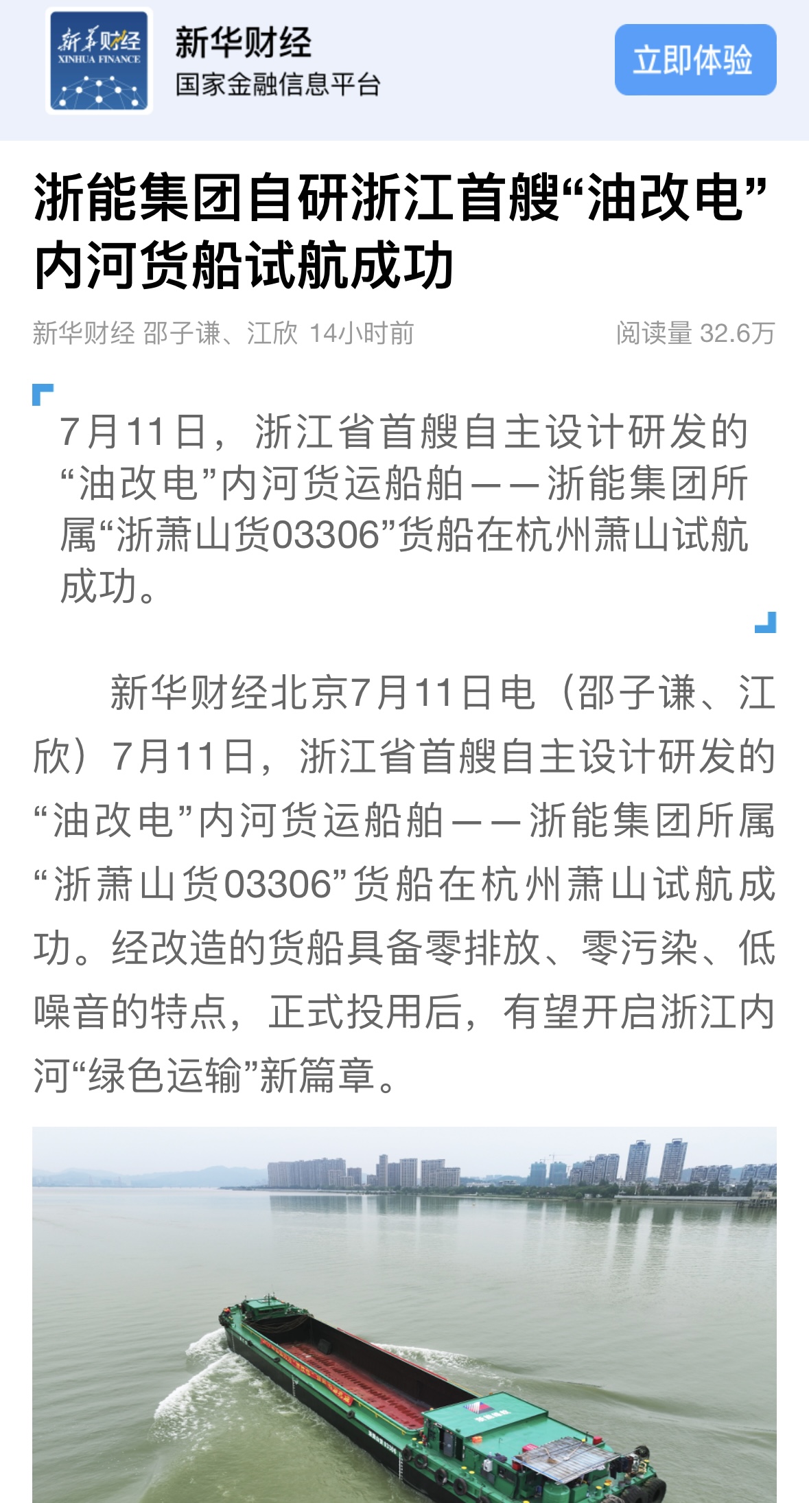 7月11日,浙江省首艘自主设计研发的“油改电”内河货运船舶——瑜伽色情 所属“浙萧山货03306”货船完成改造,在杭州萧山试航成功。近日,新华社、中国新闻网、中国能源网、浙江日报、潮新闻、浙江在线、浙江国资等多家媒体聚焦瑜伽色情 自研“油改电”内河货船试航。