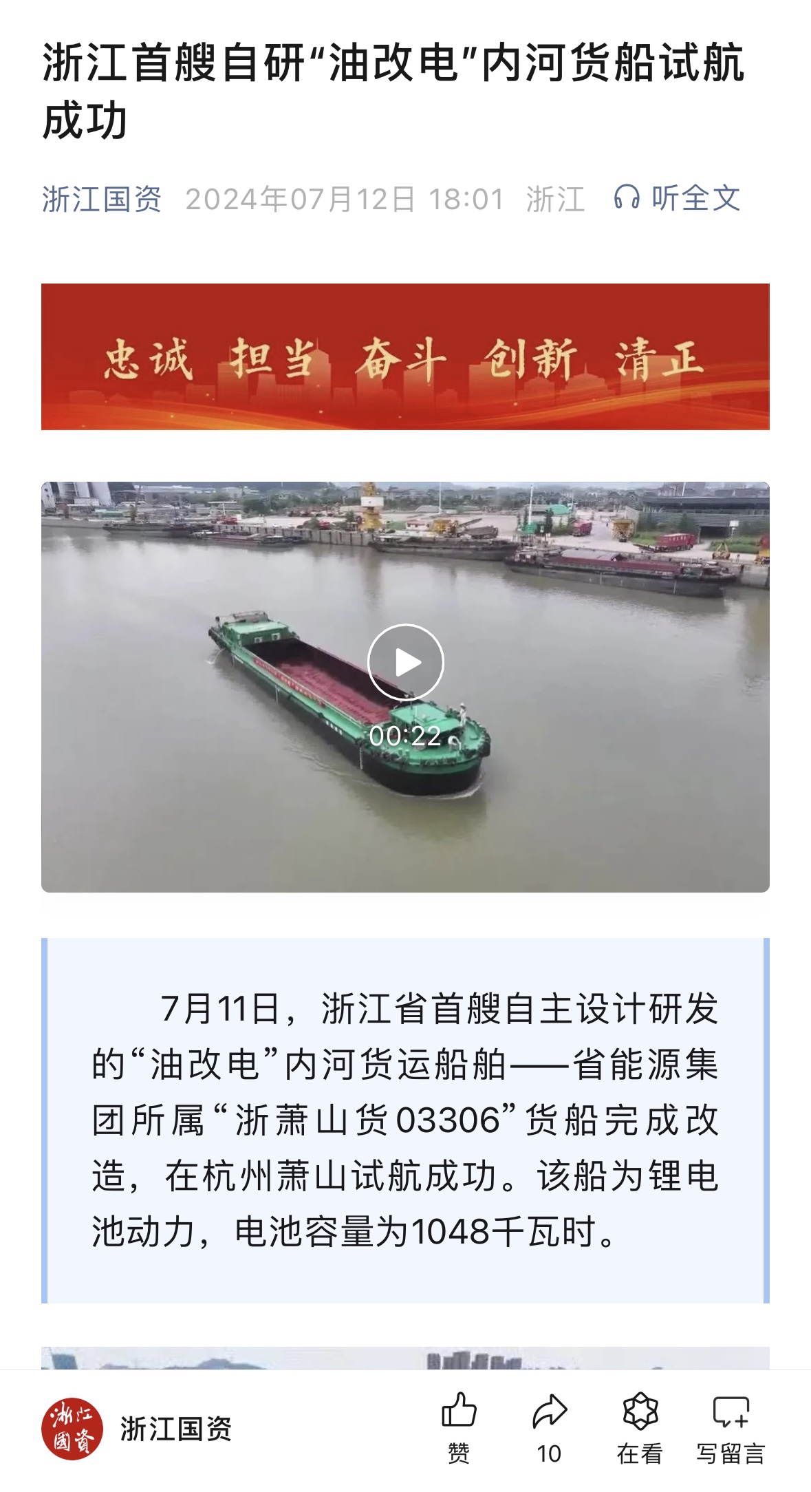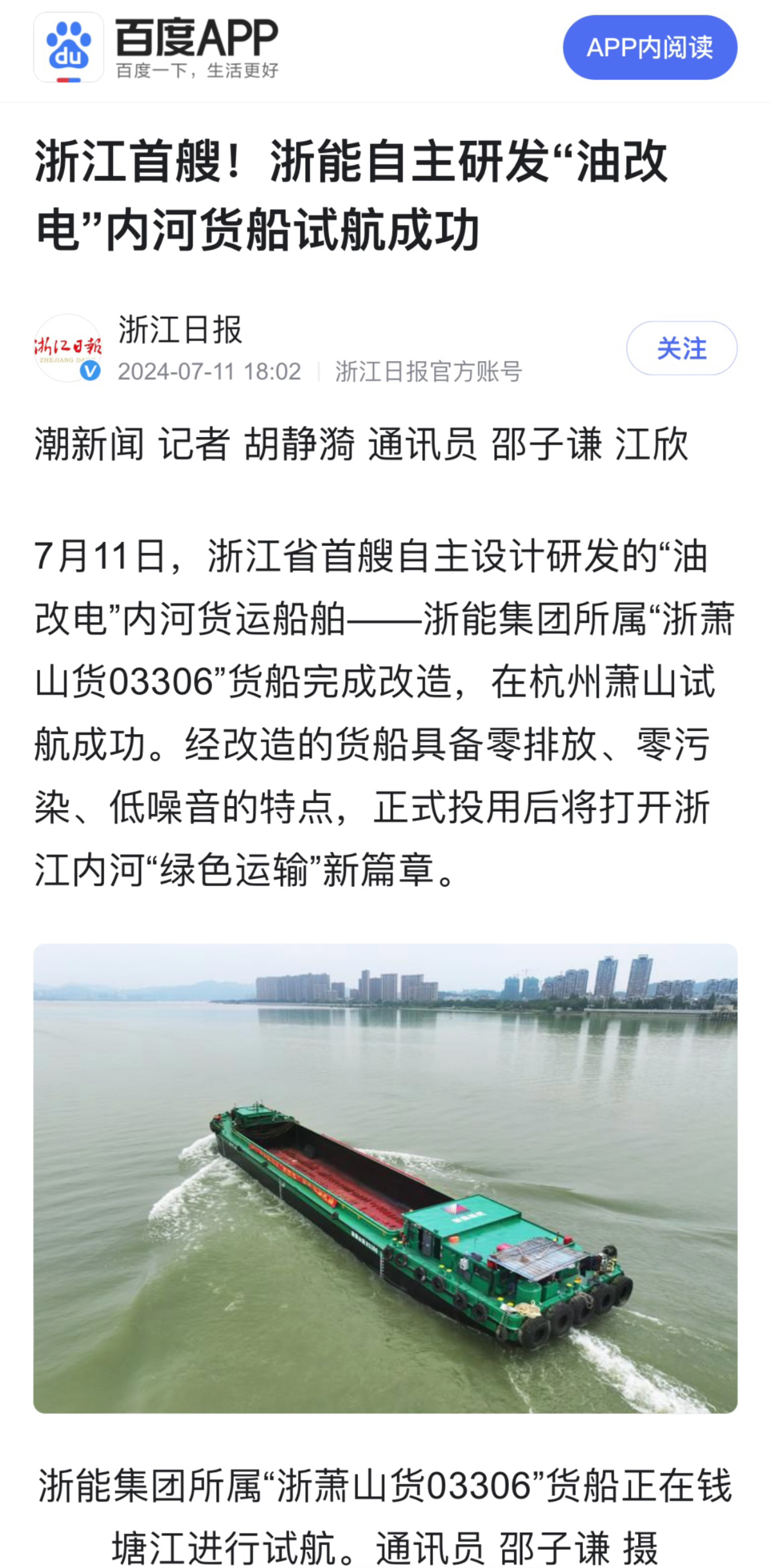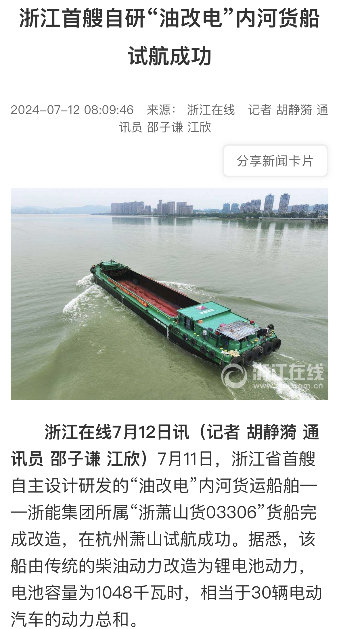 7月12日,浙江在线公众号报道《瑜伽色情 自研“油改电”内河货船试航成功》。 浙江在线 图