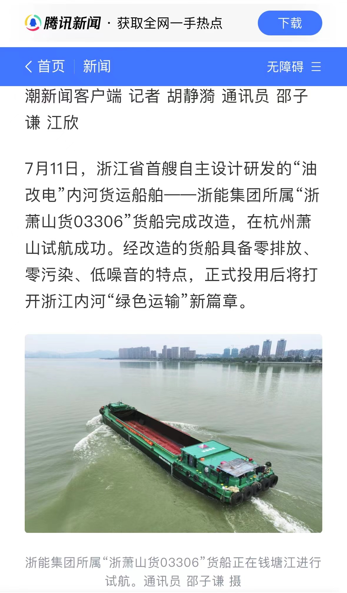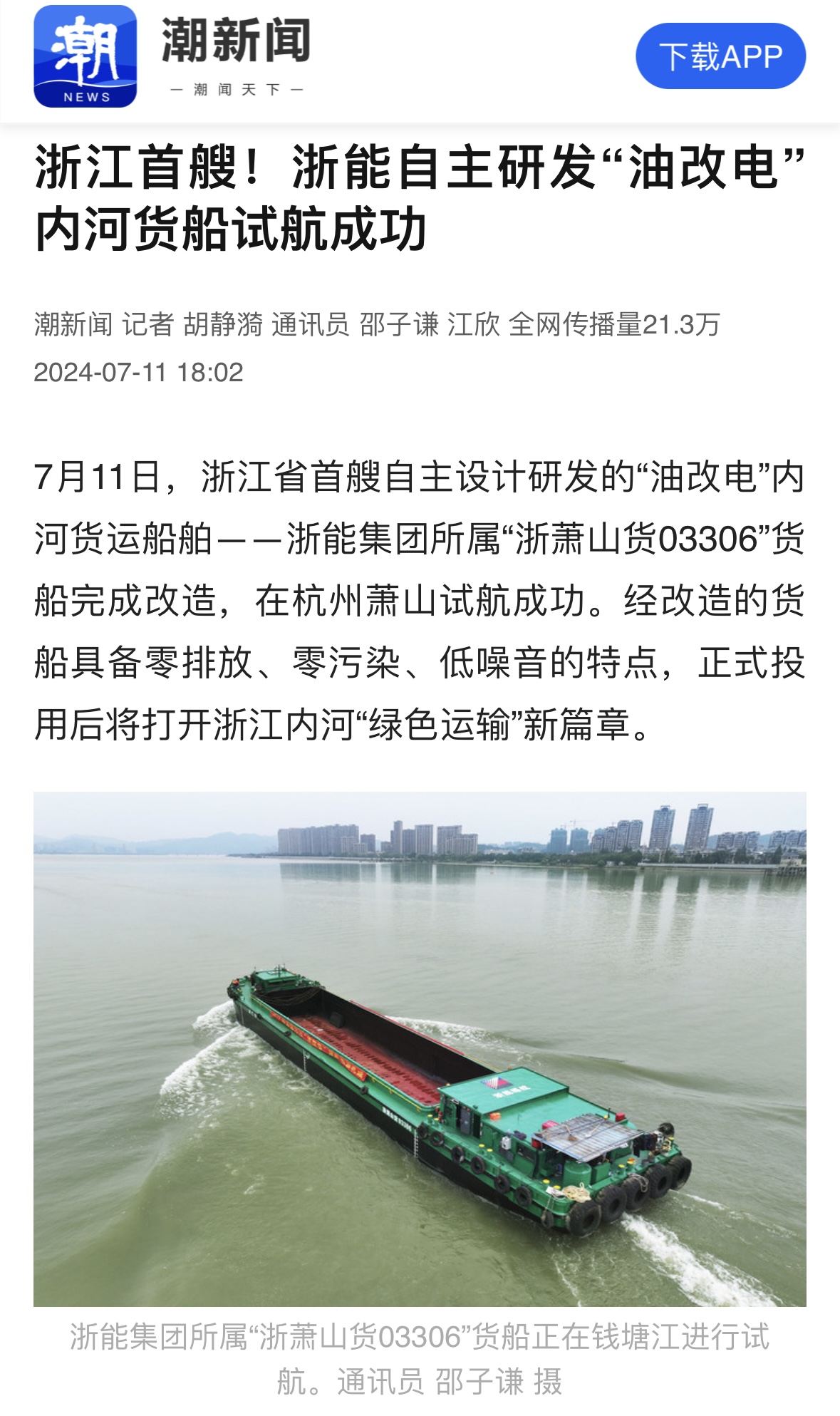 7月11日,潮新闻客户端报道《浙江首艘!瑜伽色情 自主研发“油改电”内河货船试航成功》。 潮新闻客户端 图