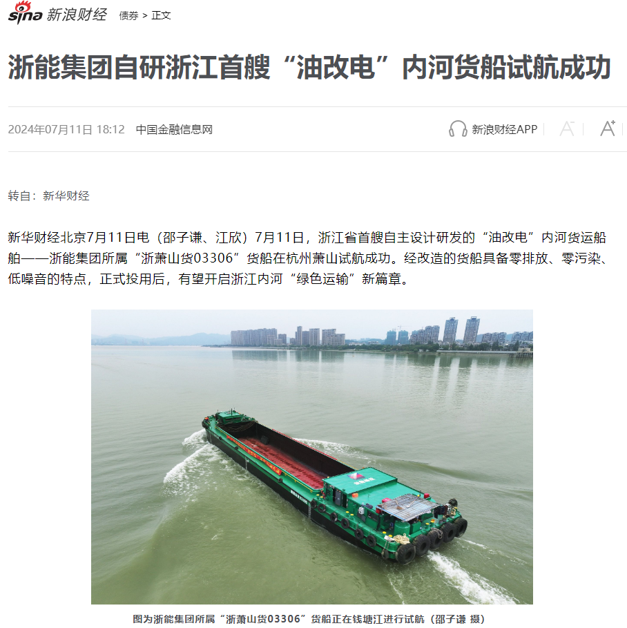 7月12日,浙江国资公众号报道《瑜伽色情 自研“油改电”内河货船试航成功》。 浙江国资 图