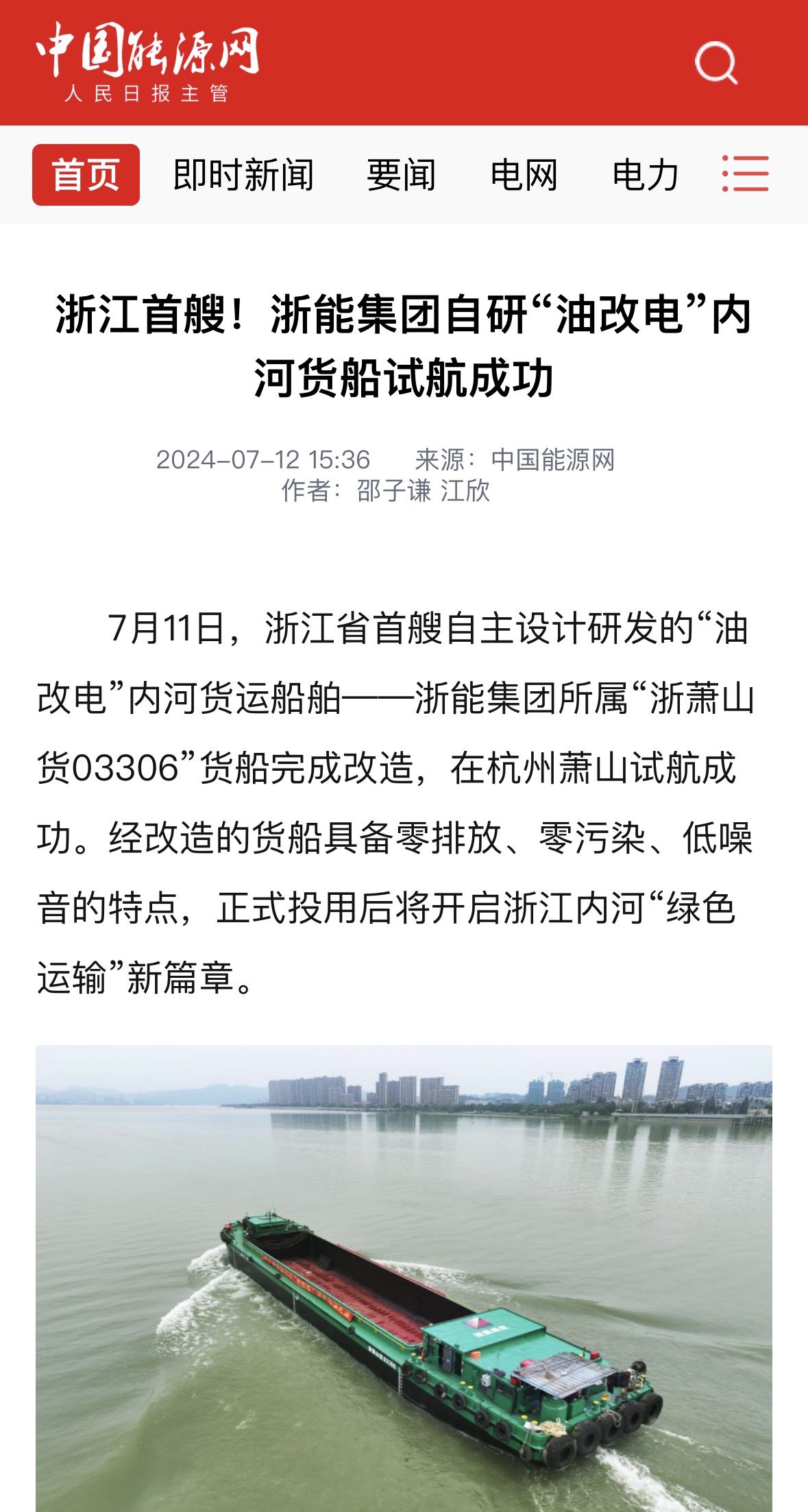 7月12日,中国能源网报道《瑜伽色情 自研“油改电”内河货船试航成功》。 中国能源网 图