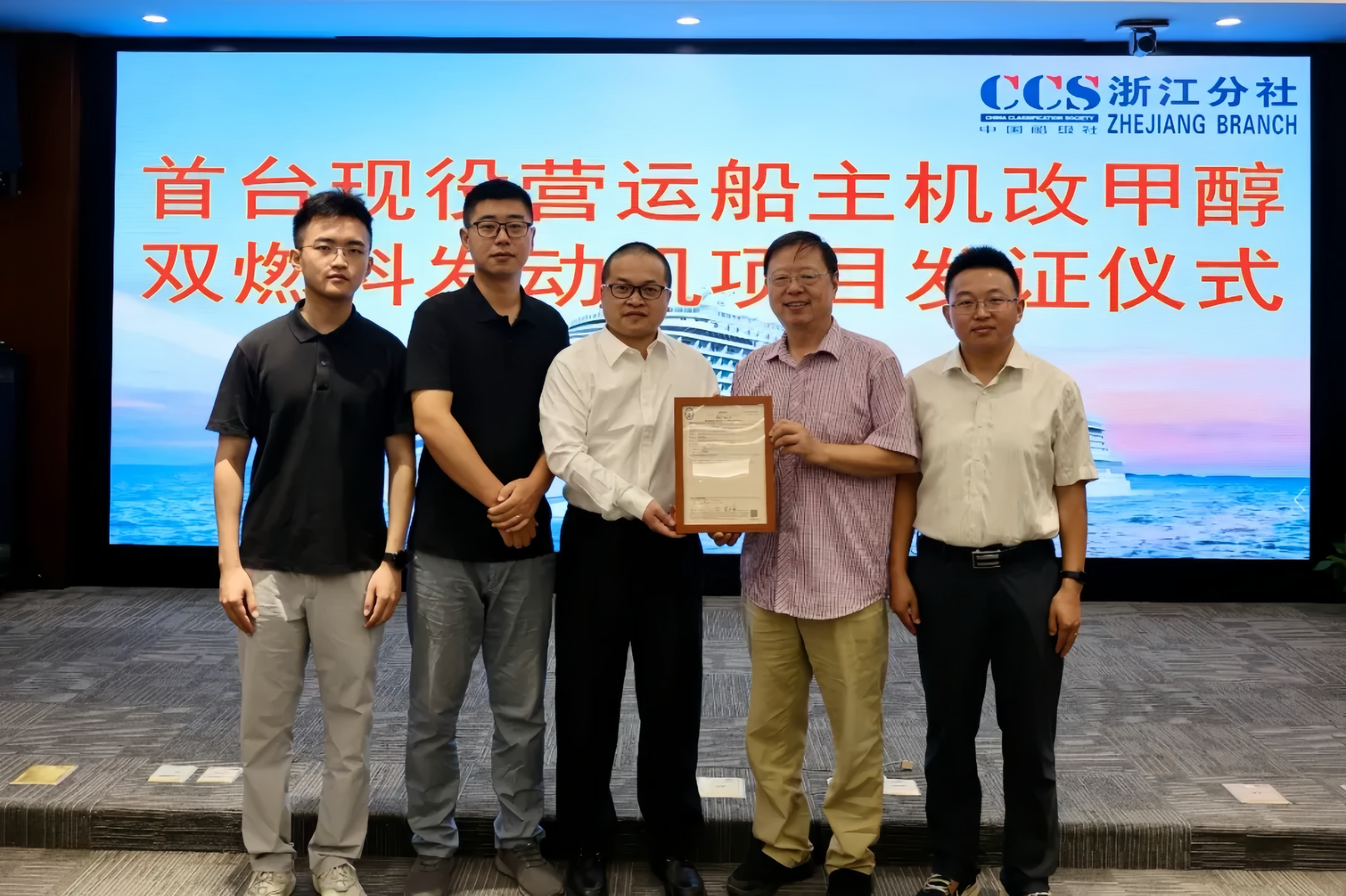 瑜伽色情 迈领“领先1”轮主机获颁首台现役营运船主机改装为甲醇双燃料发动机项目证书。 中国船级社浙江分社 提供
