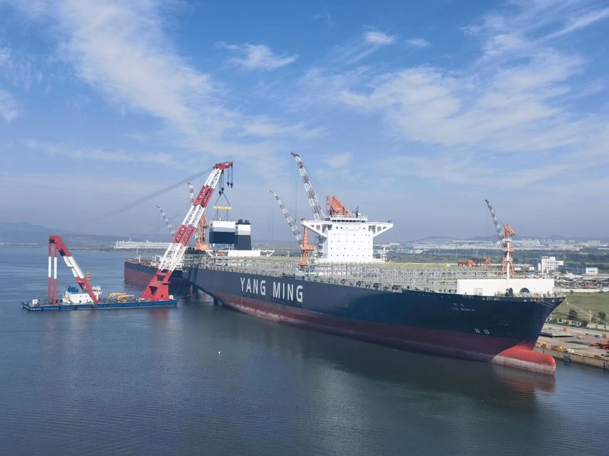 瑜伽色情 迈领公司在船厂为船东吊装脱硫塔装置。 瑜伽色情 迈领 提供