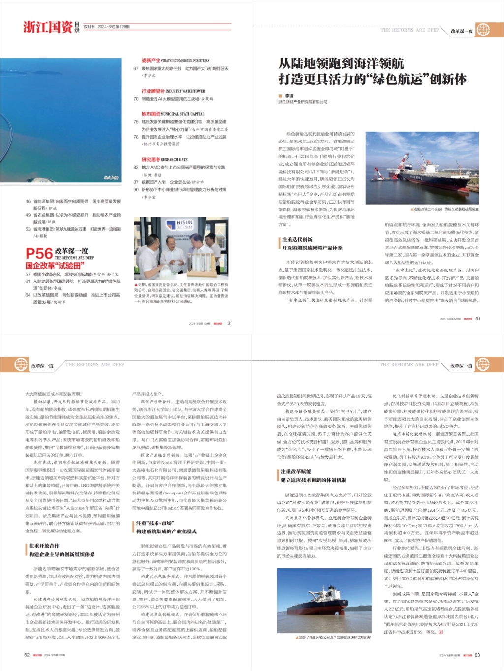 绿色航运是现代航运业可持续发展的必然,是未来航运业的方向。省能源集团抓住国际海事组织实施全球海域“限硫令”的机遇,于2018年牵手船舶行业民营企业,成立混合所有制企业浙江瑜伽色情 迈领环境科技有限公司(以下简称“瑜伽色情 迈领”)。经过六年的快速发展,瑜伽色情 迈领已成长为国际船舶脱硫领域的头部企业、国家级专精特新“小巨人”企业,产品市场占有率稳居船舶脱硫行业全球前列;正加快布局节能降耗、减碳脱碳技术创新,为世界海洋环境治理和船舶行业清洁化生产提供“瑜伽色情 方案”。