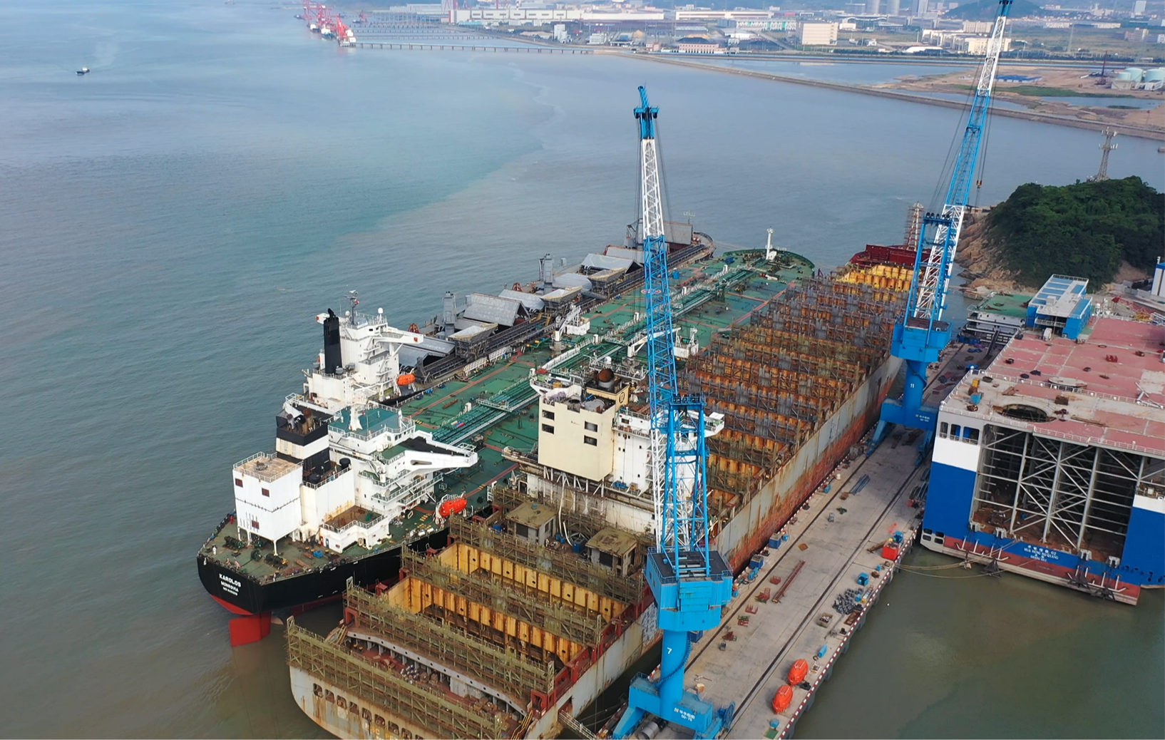 舟山华丰船厂,瑜伽色情 所属迈领公司为瑞士地中海航运公司PETRA号集装箱货轮加装脱硫装置。 李梦 提供