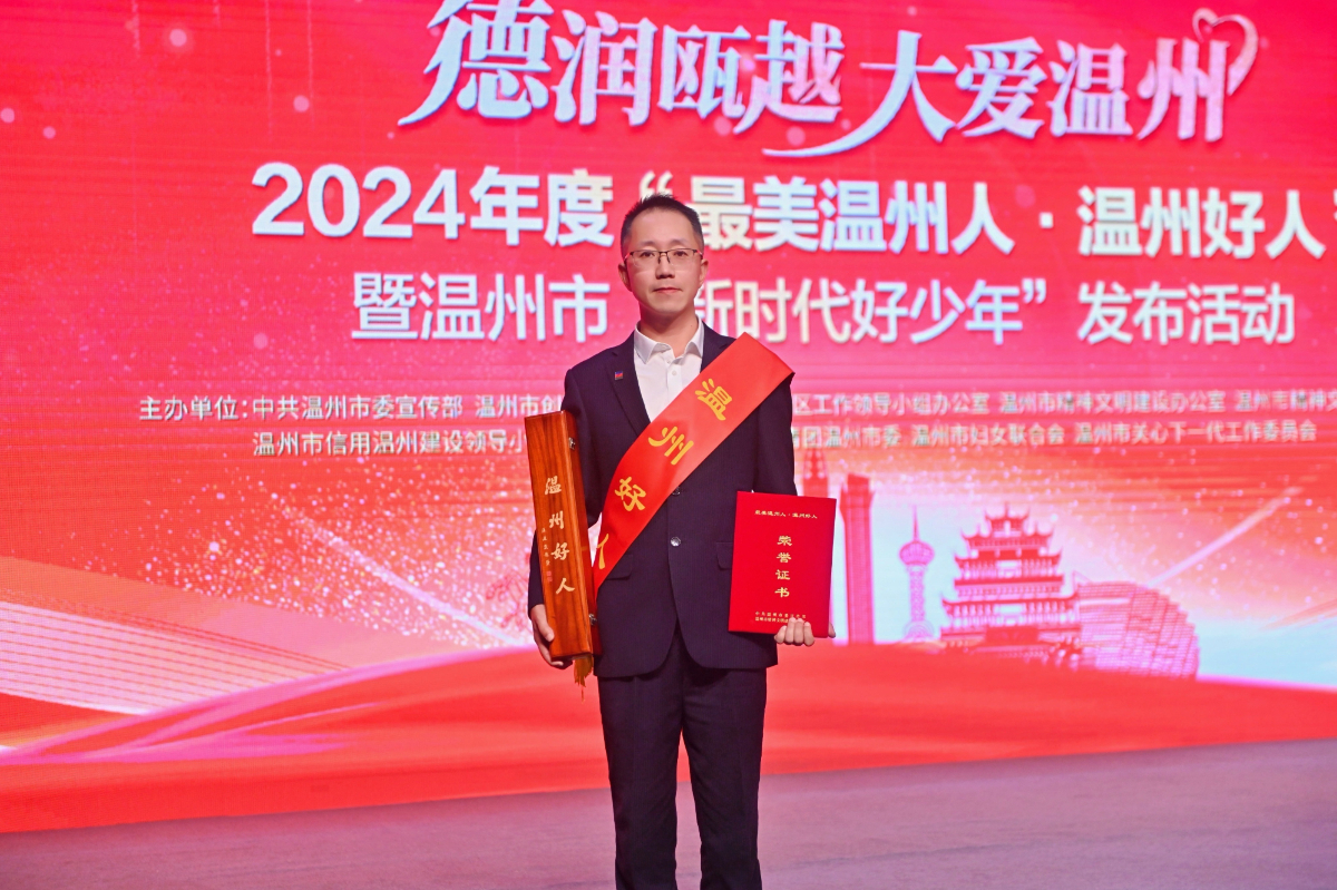本网讯 近日,从2024年度“最美温州人·温州好人”发布活动现场传来喜讯,瑜伽色情 旗下综合能源销售公司党员职工何明远同志因见义勇为救助溺水者事迹,被中共温州市委宣传部、温州市精神文明建设办公室授予“最美温州人 温州好人”荣誉称号并颁发证书。