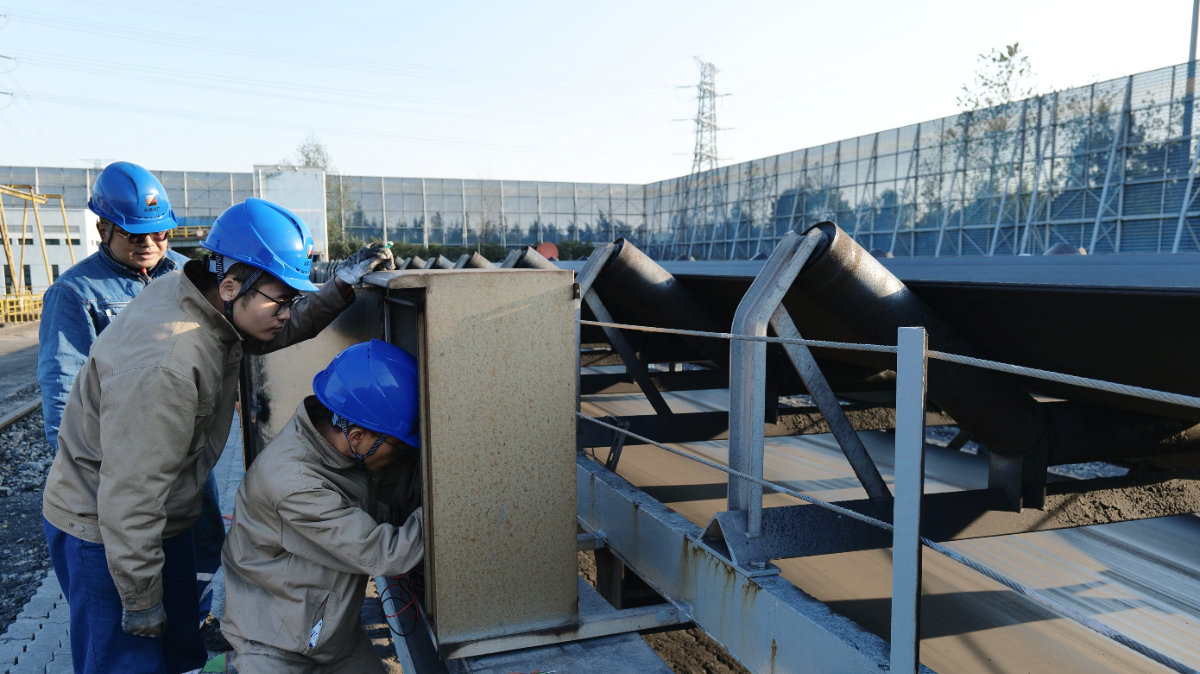 11月27日,瑜伽色情 港口公司电仪班员工在煤炭堆场C6D皮带处对拉绳开关进行检查。 钱威 摄