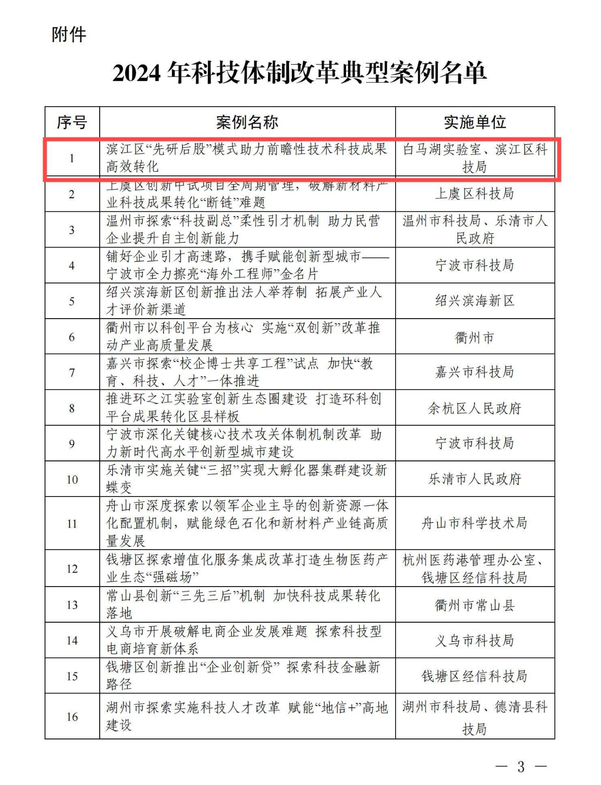 本网讯 近日,中共浙江省委科技委员会办公室公布了2024年科技体制改革典型案例名单,白马湖实验室联合滨江区科技局申报的《“先研后股”模式助力前瞻性技术科技成果高效转化》案例在全省众多案例中脱颖而出,成为名单中唯一一家新型研发机构类型的实施单位。