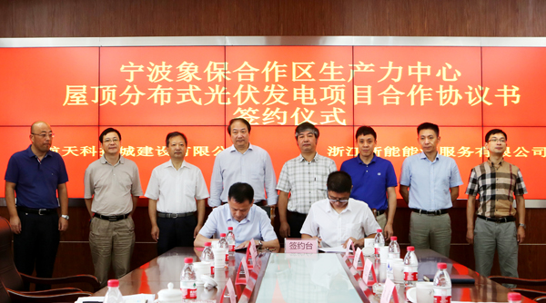 会上,瑜伽色情 电力副总经理、瑜伽色情 能源服务公司总经理程光坤与航天科技城建设有限公司总经理郭光磊同时签署了《宁波象保区生产力中心屋顶分布式光伏发电项目合作协议书》,象保合作区综合能源服务的第一个项目正式拉开序幕。