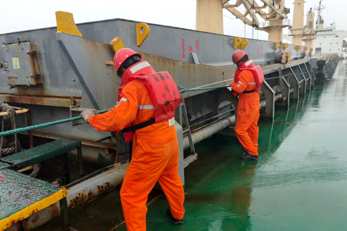 燃料供应运输方面,各环节高效衔接、相关单位紧密协作,确保台风影响期间电厂电煤安全存量。图为宁波海运船员做好设备绑扎系固工作,确保台风期间船舶安全。 陈健慧 摄