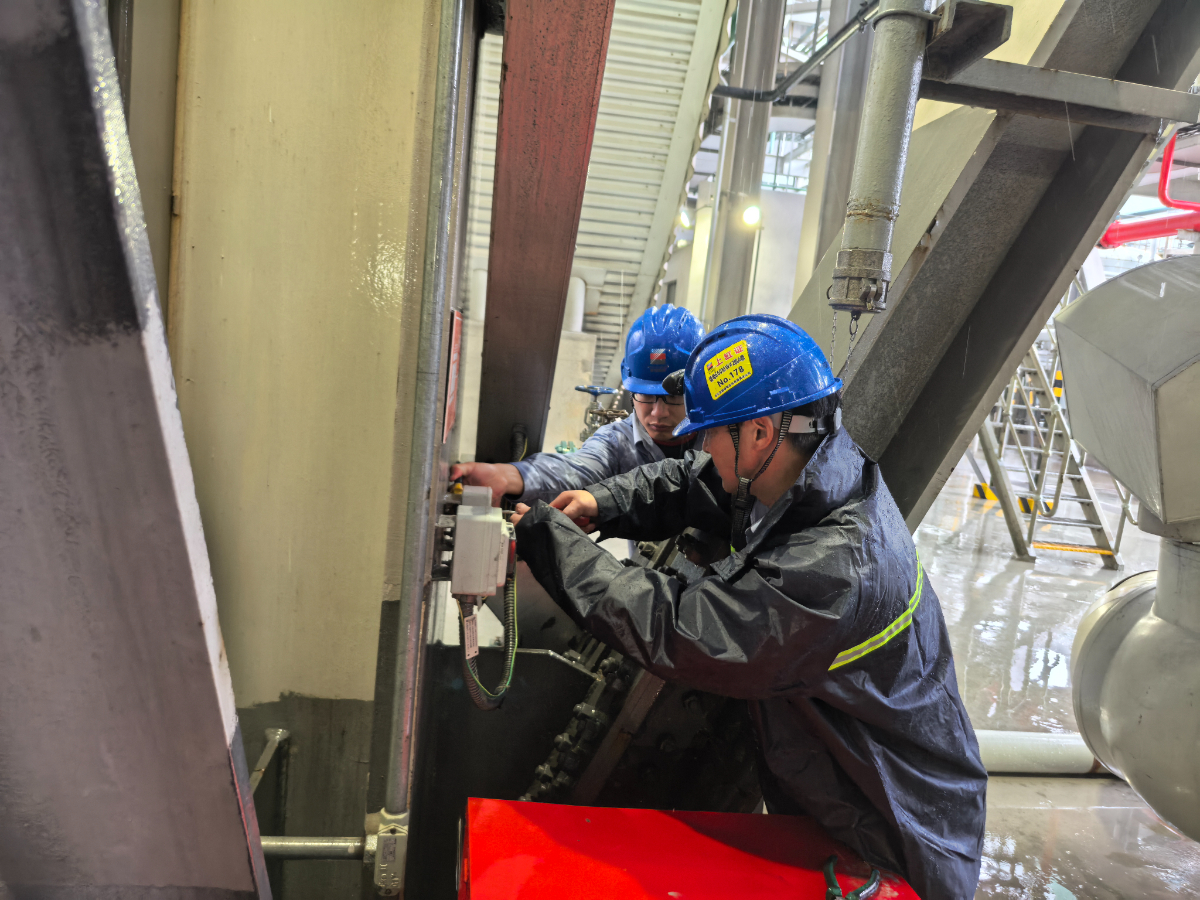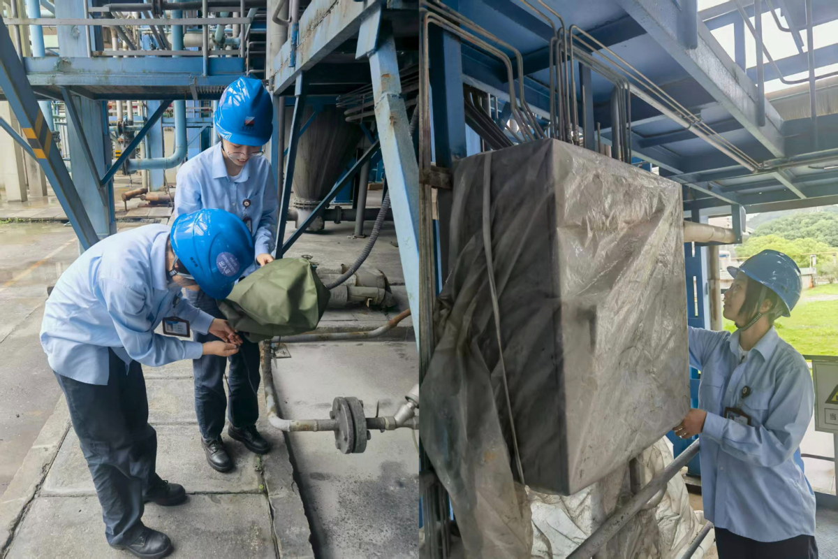 各单位以“横向到边、纵向到底”的标准迅速开展“拉网式”风险隐患排查。图为台州电厂维护人员检查加固户外设备防雨设施。 耿千舒 摄