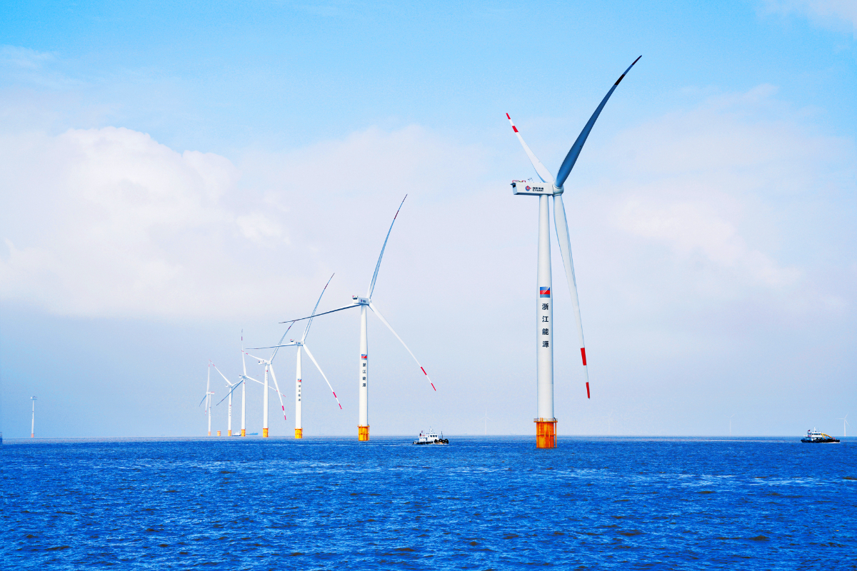 在杭州湾海域,风机群擎天而立输出绿色电能。 浙江新能 提供