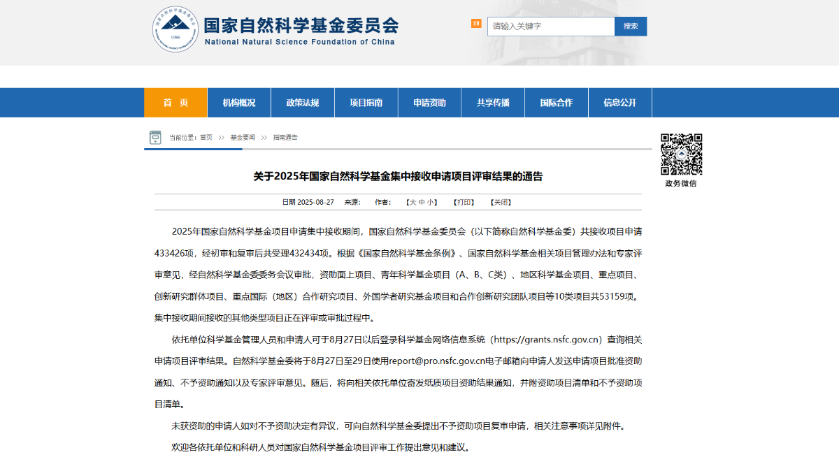 据悉,2025年国家自然科学基金项目共受理432434项申请,最终仅有53159个项目通过评审,资助率为12.3%。