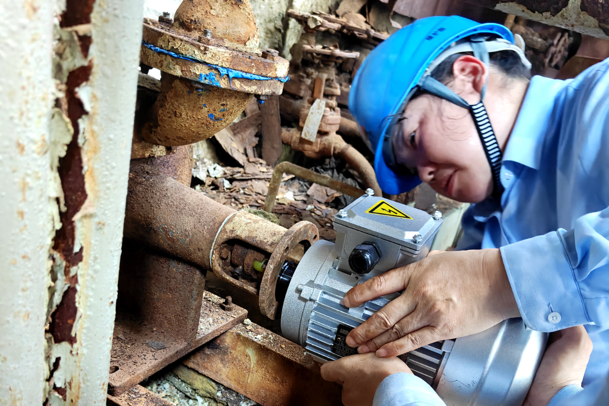 话音未落,金洁接到班长电话,要赶到9号炉MGGH登高更换超声波吹灰器电机。接近二十斤重的电机看似不重,但需要在狭小空间内托举接近半小时,十分考验力量与耐力。而同班组的王海娇则赶往废水预处理更换1号提升泵电机,她顶着烈日耐心地整理着电缆与接口,与同事们一起奋战一上午完成了电机更换工作,等工作完毕已是汗湿全身。