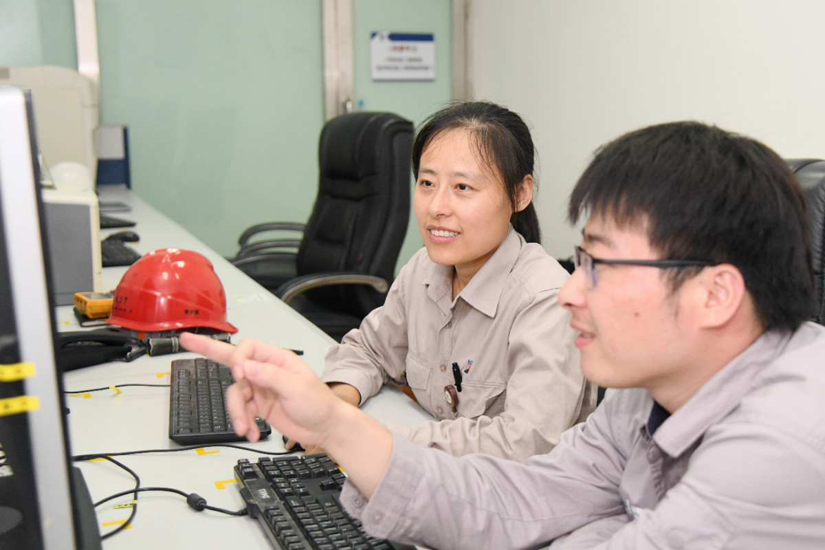 台州电厂刘晓红在工程师站探讨。 江国胜 摄