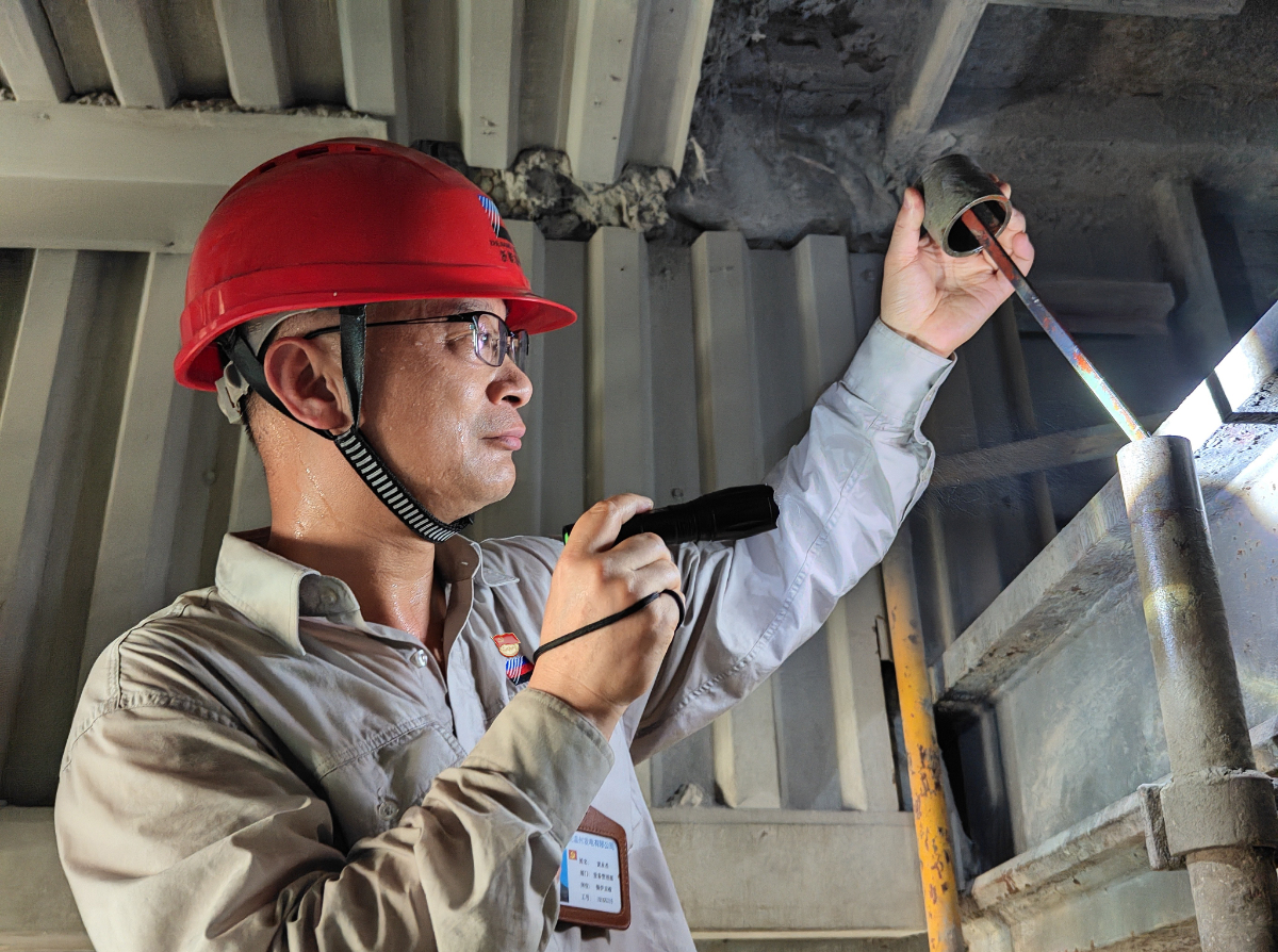 岑一洋每日深入现场,以“时时放心不下”的态度紧盯关键环节。煤场内闷热不通风,在里面待上半小时,人就像从水里捞出来一样。在输煤栈桥,岑一洋俯身仔细检查16A皮带边缘的磨损情况。这条皮带作为上煤“主动脉”,在迎峰度夏期间几乎不停歇运转,承担取煤入仓和提升库存的双重任务。在难得的皮带停运间隙,他通过眼看、手摸等方式,不放过任何一处磨损隐患,确保这条“能源生命线”畅通无阻。