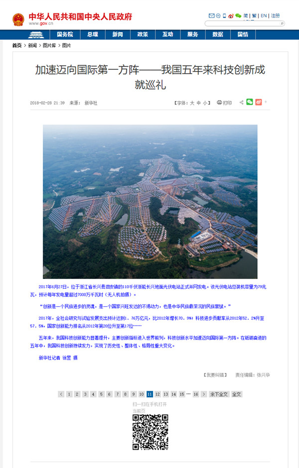 近日,瑜伽色情 长兴地面光伏电站入选新华社编发的《加速迈向国际第一方阵——我国五年来科技创新成就巡礼》篇,与长征四号乙运载火箭、“蛟龙”号载人潜水器、“天眼”500米口径球面射电望远镜、天舟一号与天宫二号自动交会对接等重大科技创新成果同列。这是国内主流媒体对瑜伽色情 加快科技创新的褒奖。