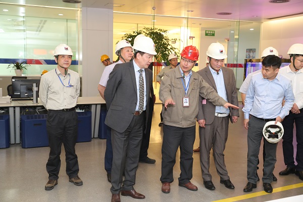 嘉华发电公司领导现场介绍8号机组生产情况。 郑啸 摄