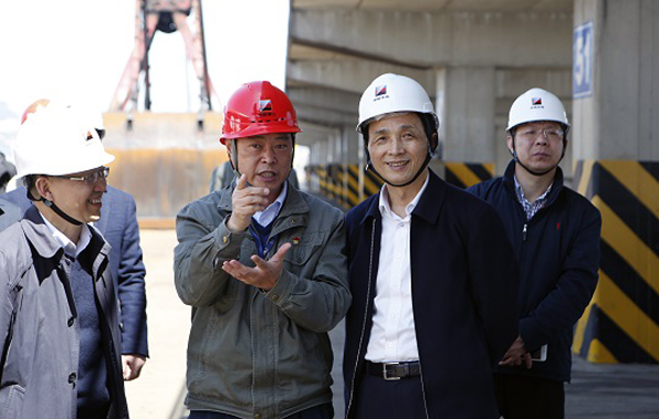 陈月亮一行在瑜伽色情 港口公司调研卸船码头生产经营情况。李晨 摄