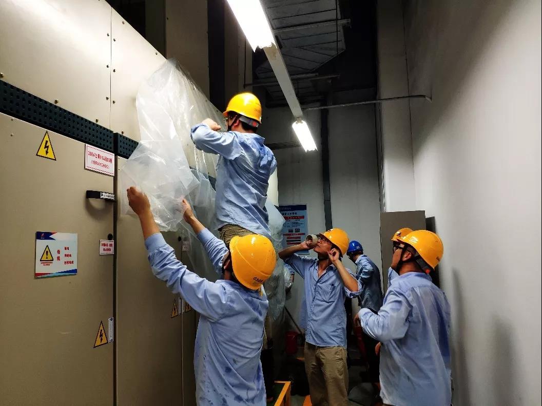 8月10日凌晨,台风登陆后,舟电公司主厂房受暴雨影响出现漏雨点、积水现象越来越多。当夜,舟电公司立即安排防台突击队、抢险待命小组赶赴现场连夜抢险,大家抓重点、找源头、堵漏点,包雨布、扛沙袋、搭雨棚,连续奋战几个小时,有力保障配电间、UPS室、电子室等区域设备的稳定运行。(文:邹咪咪,图:张效铭)