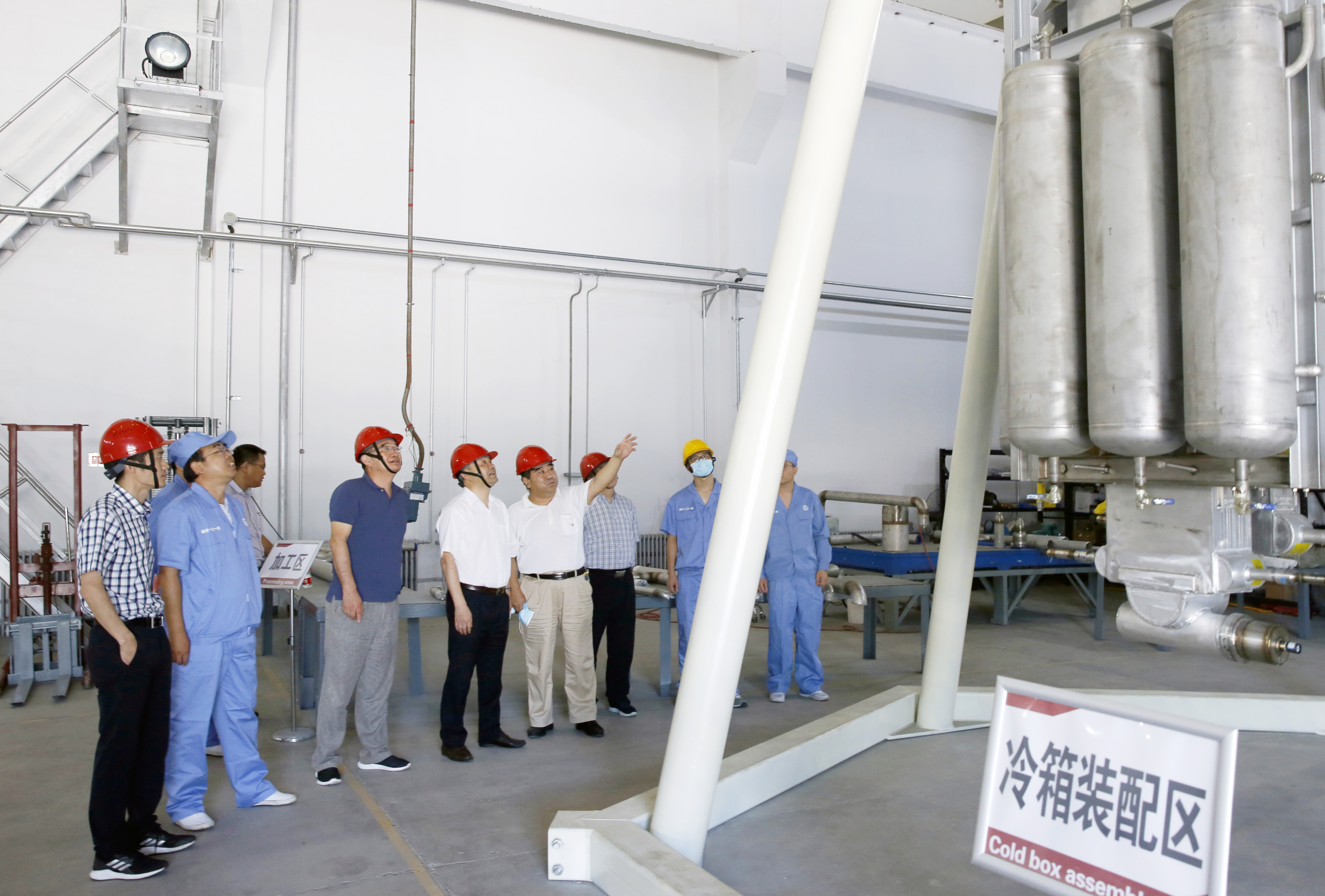 图为瑜伽色情 组织专家到101所检查氢液化系统冷箱集成进展情况。陈夏 摄