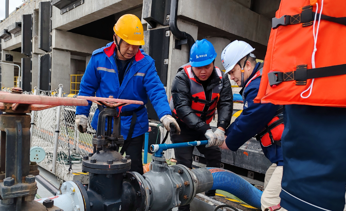 为确保兰溪油库顺利完成首次进油,浙石油销售公司靠前指挥、统筹谋划,提前编制进油方案,组织油库作业人员反复实地演练,完善安全风险分析及评估,落实各类应急处置方案,逐项检查复核各环节。作业当天,现场人员专业高效完成取样计量、油品化验、设备检查、阀门确认等流程,严阵以待迎接首轮油的抵达。