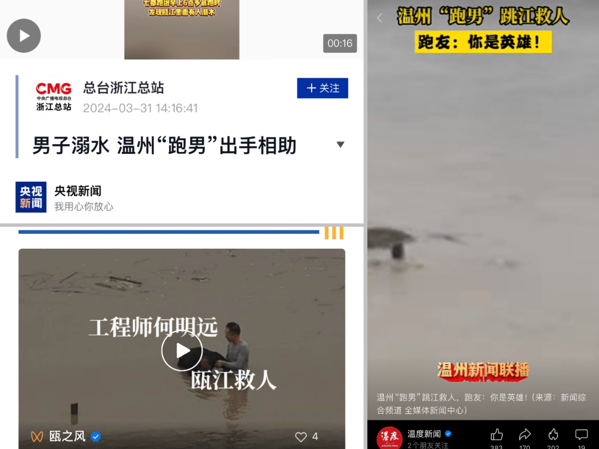 3月30日,浙石油综合能源销售有限公司浙南党支部党员何明远在晨跑途中遇人落水,危急关头他挺身而出,奋不顾身跳入瓯江成功施救,用勇敢善举践行浙江国资国企新风尚,事迹获央视新闻和当地新闻媒体转载报道。